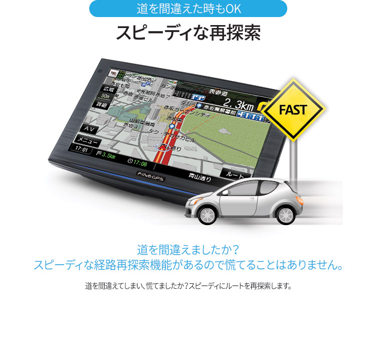 FineGPS iQ 7000は特許技術TurboGPSにより常に正確な位置情報を把握でき、その技術は高架下などの感度の悪い場所でさえ発揮できます。ブレのない位置情報とともに、信頼のおけるゼンリン地図情報も毎年更新が受けられ、当初3年間は無料で提供されるのでお得に最新情報を取得でき、道に迷う心配もありません。るるぶDATAが搭載され、スマートフォンを使った操作も可能なので、ドライブも快適・便利になります。さらに渋滞や事故、工事やイベント等による交通規制などの交通情報を随時案内するVICS機能も1年間は無料で利用できます。オービスの設置場所や交通取締まり情報などをアイコンや警告音で知らせてくれるオービス案内サービスも3年間無料でアップデートされるなど、ドライバーにとっては気になる痒いところに手が届くサービスが満載です。homepageやofficial blogも用意されているので、FineGPS iQ 7000に関する最新情報も何時でも直ぐに手に入れられます。