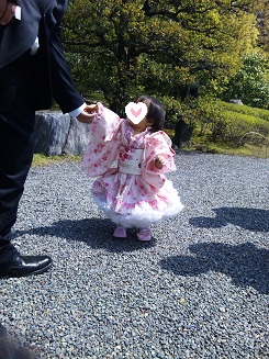 二日目は京都で結婚式に参加参加は披露宴からと聞いていたんですが手違いだったみたいで急遽式も参加することに 式は二条城で行われました新郎新婦が牛車に乗りその後を参列者がついて歩いたんですが着物ドレスを着ていたハルはかなり目立ってました外国人観光客にバシャバシャ写真とられてたし(笑)参列者の方々にも好評でいろんな方と一緒に写真撮っていただきました この日に限ってハルは自分の自由にしたくて抱っこしても反り返ってぎゃ~ぎゃ~暴れるし下におろせば暴走するしで大変でしたいつもはそこまでじゃないんですが・・・結婚式も披露宴も暴れ倒しでゆっくり見る暇無くぐったりでしたまだじぃじとばぁばがいてくれたからよかったものの やはり赤ちゃん連れの結婚式は大変ですね^^; ハルがもぅ少し大きくなったらまた旅行に行きたいな今度は綿密に計画立てて行きたいです^^; template-yamato