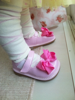 続いて最近届いてたmooshuのピッピ靴の着画~お色はPinkPatentでサイズは5(13.3)にしました普段12センチなのでちょっと大きめですがベルトをしっかりとめれば大丈夫でした 来月結婚式に参加するのでその時に履かせる用に購入エナメルだから結婚式にもな感じだし結婚式が終わっても普段使い出来るのが でもやっぱり固めなので歩きずらそう・・・でも前ほど嫌がらずに履いてくれるようになりました リボンの色は届くまでわからないということでしたがショップ画像と同じ無地のショッキングピンクのリボンでした イロイロ替えリボン作って楽しみたいなぁこのリボンなら簡単に作れそうかなtemplate-いなもとtemplate-いなもと