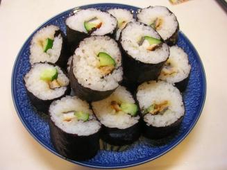 せっかくおせち料理を作ったのだから写真を撮ろうと思っていたのに食べつくしてしまいました~。でも、たいしたものを作ったわけではありませんのよ~。お煮しめの代わりに筑前煮にしました。後は干ししいたけを煮たり、高野豆腐を煮たり。ごまめを作ったり。いつもお正月には(お正月だけじゃないけれど)うなぎときゅうりの巻き寿司を作ります。これは、以前の日記に書いた伯母がお正月に作っていたのです。(伯母の名が春子なんです。)お酒を飲んでいる人も、お腹が空いたらちょいとつまんで食べられてお酒のつまみにもなる。子どもの時は鰻が食べられなかった私もお箸で鰻を突き出して(笑)食べてました。 あはは~、具が真ん中に入ってないですわ~。うまくならないわぁ、お寿司巻くの。