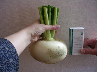 『おおきなかぶ』って絵本がありますが、今日は絵本じゃなくて野菜です。 私の手だけでもわかるでしょうが、たばこを横に並べてみました。(笑)おおきいです。葉は切られて届きましたが長いのですよ~。ついでに根も切ってありますが、それも長いはず。「弘岡かぶら」といいます。いつも野菜を届けていただいている「らでぃっしゅ」さんから届きました。千枚漬けにしたりするそうです。かぶら寿司にもするそうです。かぶら寿司は氷見のものと思っていましたが、違う地方でも作るのですねぇ、知らなかった。弘岡は高知ですよね?甘酢に漬けても美味しいそうです。どうして食べようかなぁ~。蕪の季節ですねぇ。今日は小蕪をサラダにしました。 小蕪を薄く切って塩をして、明太子マヨネーズで和えただけ。シャキシャキとおいしいです♪明太子マヨネーズはやまやの明太子が使われています。 このマヨネーズ、ぴりからで美味しいです~。