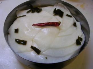 先日の「おおきなかぶ」を千枚漬けにしてみました。でも、作り方を知っているわけではないので、あくまでも「なんちゃって千枚漬け」です。 こんな感じ♪丸いまま薄切りにしたかったのですが難しかったので半月にしました。下漬けをして、さっと塩を洗い流して昆布や唐辛子を入れて甘酢に漬けてあります。本式に漬けるのはきっともっと塩をして一晩ほど置いておくのでしょうか?私はほんの一時間ほど塩漬けしただけです。だって今晩食べたいじゃないですか~。今、冷蔵庫の中でお休みいただいてます。わが家の夕飯は主人の帰宅が遅いので4時間は甘酢に漬けられます。私の薄切りが上手じゃないので薄いのやら厚いのやらいろいろです。スライサーが使いたかったのですが、蕪が大きすぎて断念。包丁で頑張ったんですが、最後の方が難しくて薄さがさまざまになっちゃいました。薄いのが早く漬かっているでしょうから(怪我の功名?)薄いのから取り出して食べましょう~。