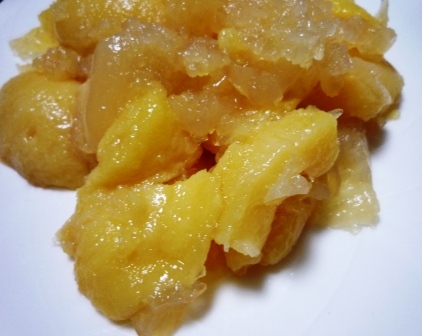 先日スーパーに行ったら、限定でひと箱1050円、2キロで22個入っている山梨県の白桃(秀)を見つけてしまい、購入しました。桃ジャム作ってもいいし~。秀と箱に記載してありましたが、すごく甘い。食感もやわらかく、すごくお得です。でもあたっているのがなくはない。そういえば灰色ウサギ0646 さんが前回のジャムで、コンポートにしてゼラチンをまぜるといいって教えてくださったっけ?そこで、モモ3個分をむき、砂糖小さじ数杯を入れて、電子レンジに2回にわけてかけ、そこにお湯でとかしたゼラチンを入れてみました。電子レンジと砂糖の効果で桃から水分が出た状態で、お湯のなかに振り入れたゼラチンをまぜました。ゼリーはなんとか固まりました。冷やしておいしくいただきました。やっぱりというか、食べるのはすぐ終わる。生でかぶりつく桃、やっぱりおいしいです。綺麗な食べごろのモモならわざわざ作る必要なないかな。。子供に聞くと、「おいしかった」「生でかぶりつくのも好きだけれど、むかずそのまま食べられるのが良かった。」といった反応でした。次はもあ427さんに教わった通り、レモンを入れてジャムを作ってみたいかな? ←良かったらクリックお願いします!(別ウィンドウじゃなくてすみません)