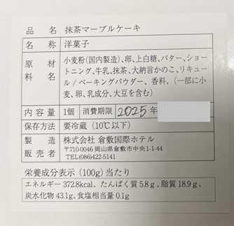 小麦粉(国内製造)、卵、上白糖、バター、ショートニング、牛乳、抹茶、大納言かのこ、リキュール/ベーキングパウダー、香料
