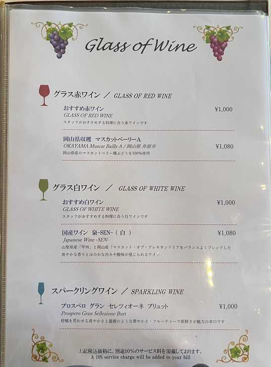お店のかたは、あっさりしている国産ワインということで、通好みではないとおっしゃってはいましたが、、、、気分はロゼだったので、それに近そうな岡山県収穫、マスカットベーリーAのグラスワインをチョイス。美しい水色。ぶどうらしい風味がしました。奥はフランス産のワイン。飲ませてもらいましたが、コクがあり、いかにもフランスの赤ワインという感じがしました。