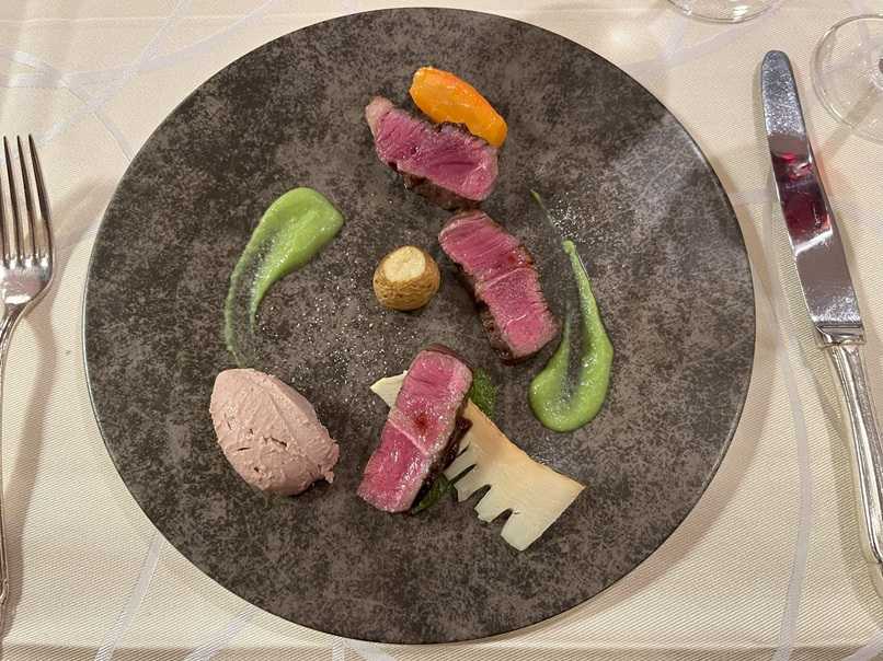 Grilled Beef Loin and Spring Vegetables Green pea Sauce with Foie gras Mousse