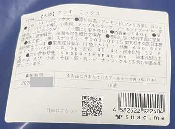 原材料はアーモンド(アメリカ産)、カシューナッツ(インド産)、小麦粉、メープルシロップ、アーモンドプードル、菜種油、ココアパウダー
