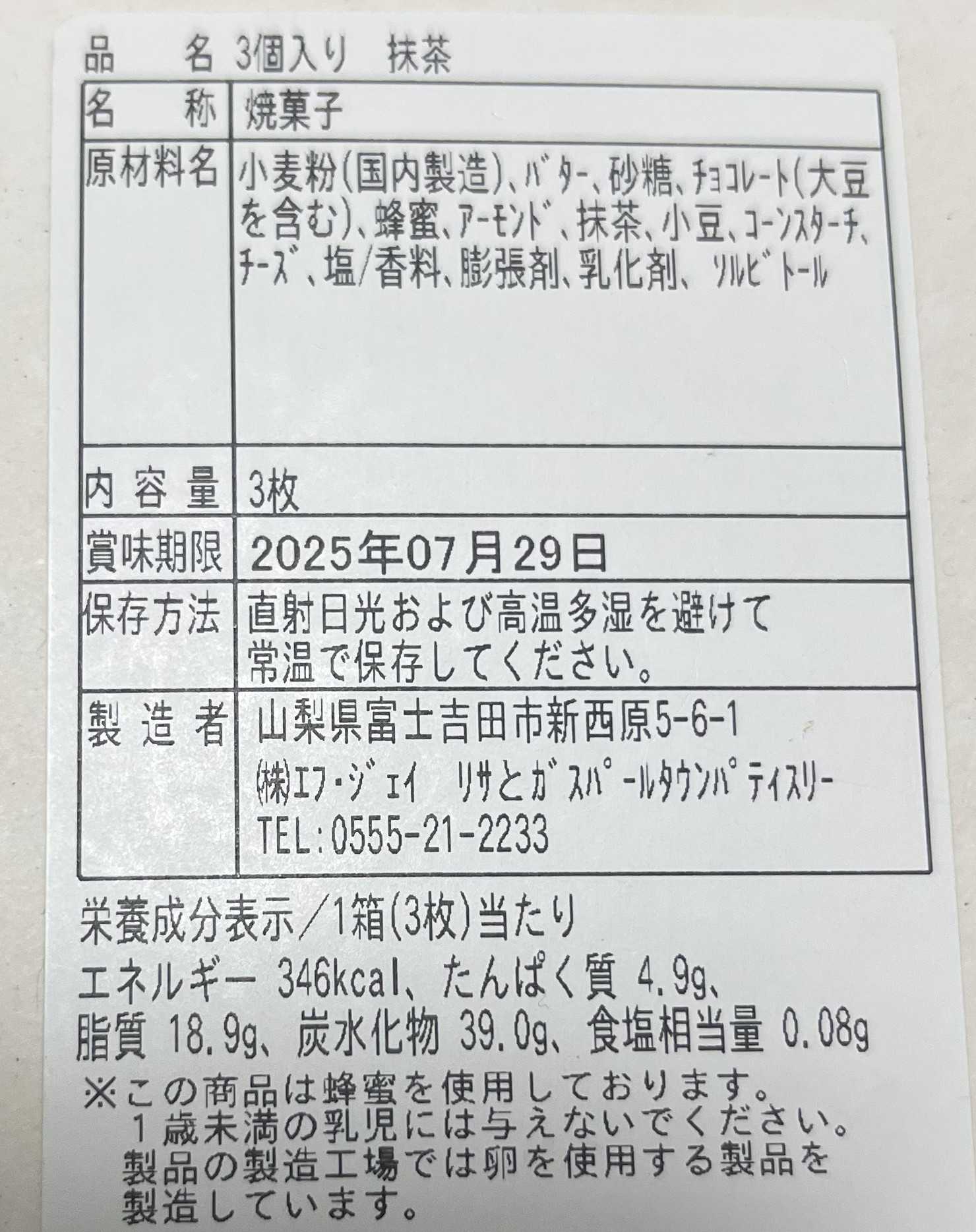 原材料は小麦粉(国内製造)、バター、砂糖、チョコレート(大豆を含む)、はちみつ、アーモンド、抹茶、小豆、コーンスターチ、チーズ、塩/香料剤、乳化剤、ソルビトール