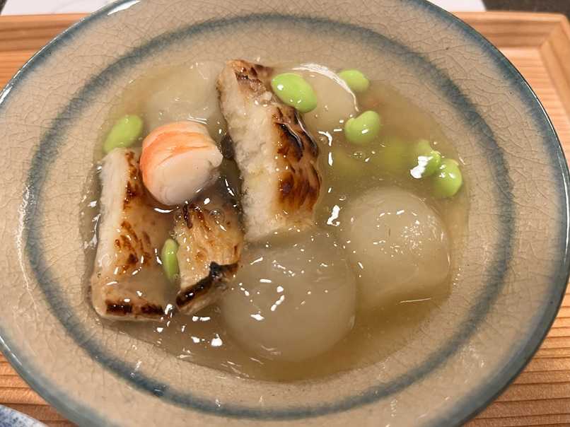 汁のなかの冬瓜はやわらかく、香りのよい鱧もやわらかく、海老はそれらよりちょっと固め、枝豆のいろどりもきれいです。