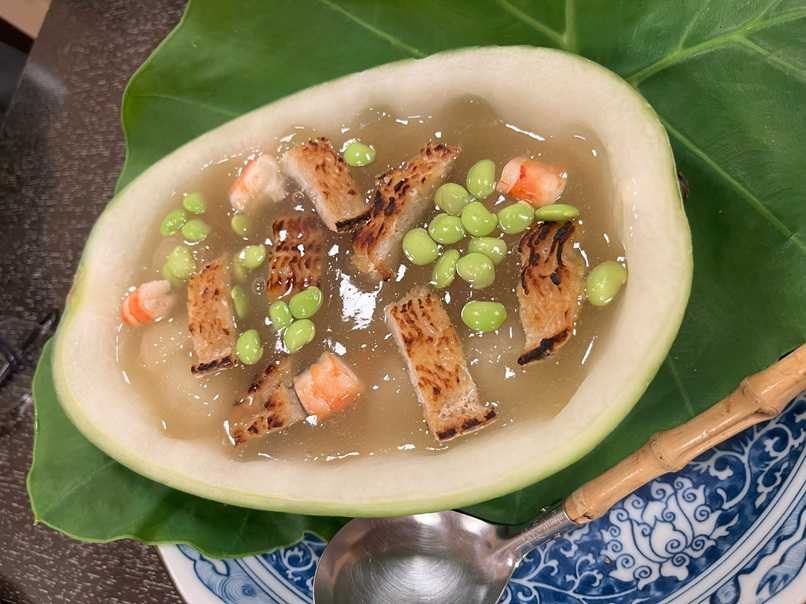 冬瓜の釜のなかに、冬瓜スープ、冬瓜やエビや枝豆、なんといっても焼いた鱧が入っています。