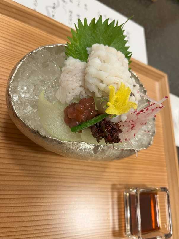 運ばれてきて、白く花開いた鱧肉と、手前の赤いマグロという色あわせなどをみて、美しさに気分が上がりました!