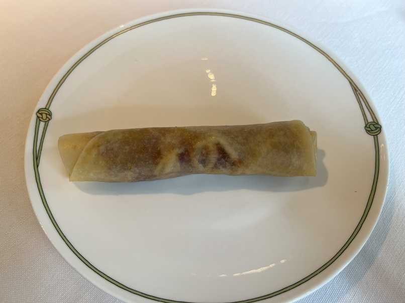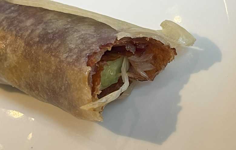 生春巻きのなかに、皮をたっぷり入れて、白髪ねぎときゅうり、そしてあまいソースを入れてまかれて出てきます。