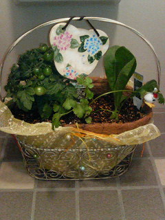 昨日は、会社の帰りに知り合いの人にフラワーアレンジを教えてもらってきました。今回は、ハーブのよせ植え植えるのは簡単なんだけど、かごを飾ったり、プレートの絵を書いたりと結構てこずって7時から初めて終わったのは10時過ぎでした(^^;プレートに絵を書くのは、細かすぎて途中でギブアップしてしまい、途中で先生に交代してしまいました・・・(^^;細かい作業苦手なんです・・・苦労の作品です。ハーブは食べれるらしいので、自分で育てようかと思ったけど、枯らしてしまいそうなので今回も、実家行きだなこれ・・・