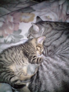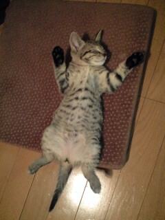 うーん…静かだ…(´ー`)今日からチビも保育園再開、お姉ちゃんも専門学校再開でひっさびさ~の一人です。家族と居る時間は楽しいけど、こういう静か~な時間が私には必要です。ネコ達も昼間は静か。落ち着くわ~(T▽T)ヒメちゃん大きくなりました。体重1キロちょうど♪来た時は600gだったんですよね。見た目は2倍くらいに見える。活発すぎるくらいで先住猫達はヒメにホトホト手を焼いてる様子です(;^_^A ダーッ!と突進してタックル!かぶりつき&ネコキック!逃げても逃げても追いかけては「遊んでー!」ってしつこいんです。度が過ぎる噛み付きに反撃されて、たまに「きゅぅ~」って鳴いてます。あ、そうそうヒメの兄妹(姉弟?)が昨日、2匹もらわれていったらしいです!♂1匹だけと言っていた貰い手さんが、他の子も見て可愛いので2匹引き取ってくれました。残りの1匹は一番大人しい子で、貰い手がなかったら飼うみたいです。実家の母がすごく喜んでました。これでゆっくり寝られる~って^^なにしろ子猫3匹の暴れっぷりがすさまじかったらしいです。さて、今日もやる気が出ないので、まったりDVDでも見て過ごします。ERをシーズン1から見ていってます。チビの休みの間見れなかったので久々。え~っとどこまで見たっけな?(;^_^A