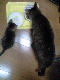 私にはあるトラウマがあります。ずっと昔、私がアパートに一人暮らしを始めて間もない頃まだ目も開いていない子猫を友人が拾って、私が猫好きなので譲り受けた事がありましてワンルームの小さなアパートで、その猫と暮し始めました。その頃、朝と夕方にバイトの掛け持ち生活でして途中、部屋に戻っては哺乳瓶でミルクを与え、寝る時はベッドの下私が手を伸ばすと触れる所にカゴを置き、その中で子猫は寝ていました。何日そのような生活が続いたのか、はっきりと覚えていませんがバイトが休みの日曜の朝でした。その子猫は私の下敷きになって死んでしまったのです。まだ片手に乗るくらいの大きさの子猫。ベッドには登って来れないだろうと油断していたのです。私が殺した…。現在のように太っていた訳でもなく標準体型だったと思いますが小さな、小さな子猫にとっては寝返りを打った私から這い出す力も無かったのです。何時間、泣き続けたでしょう。しばらくはわき腹に残った感触を忘れる事ができませんでした。いや、今でも覚えています。もう21年も前の事です。ヒメが我が家にやってきて、私が必要以上に神経が張り詰めているのはこの体験から「また寝てる間に猫を下敷きにしてしまうんじゃないか」という不安です。ヒメはその時の子猫よりずっと大きいです。でも、もし下敷きになれば死んでしまうでしょう。ましてや私は夜、睡眠薬を飲んで眠っている。布団に巻き込みやしないだろうかと、来た日から掛け布団はしまいました。毛布を足元だけに掛けて寝ています。それでも起きたらまず、ヒメの安否確認をします。私が3日でダウンしたのはこういう経緯です。ヒメをなかなか受け入れられないぶーちゃんですがカリカリを食べている横で水を飲みに来たヒメを認めてあげた瞬間の写真です^^ヒメはピョンピョン走り回り、可愛いしぐさを振りまいてくれます。お昼にウラと2匹で窓際でお昼寝して目が覚めた時、ウラをお母さんと勘違いしたのか「ミゥ~ミゥ~」と寂しげな鳴き声を出しながらウラのお腹へおっぱいを探しにもぐり込んでいました。どうすることもできないウラはヒメの頭を舐めてあげていました。まだお母さんが恋しいんだな…と切ない気持ちでいっぱいになりました。でも、その後もあまりにしつこくお腹に来られて「も~ええっちゅうねん!」とウラに怒られていたヒメでした。