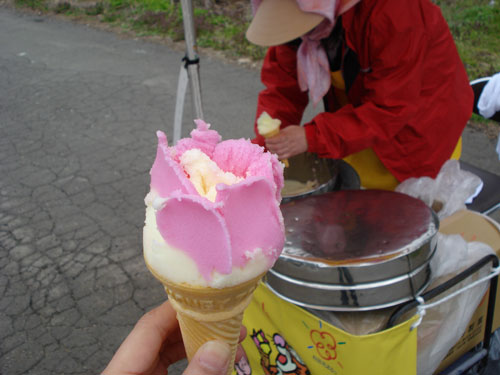 秋田で有名な食べ物のひとつ 「ばばへらアイス」おばさん(ばあば)が、へらでアイスを載せることから名づけられたとか。でもへらで載せるから、盛られたアイスはきれいなバラ模様。
