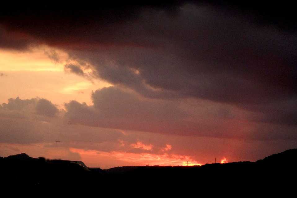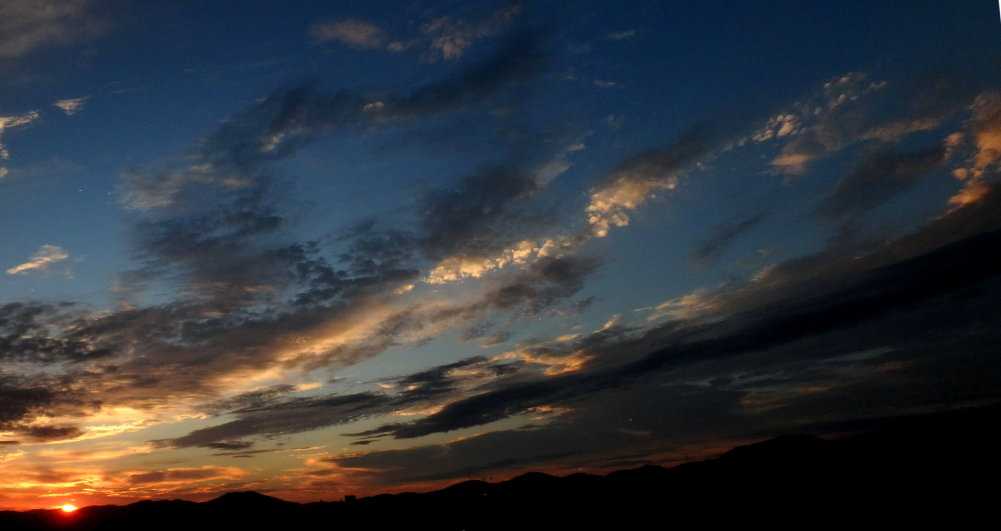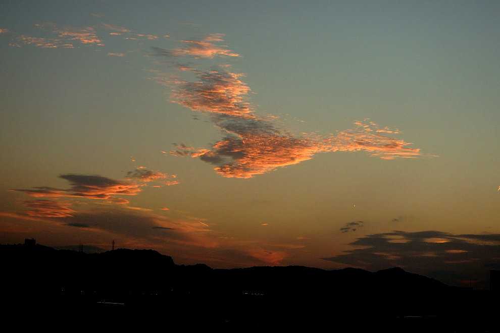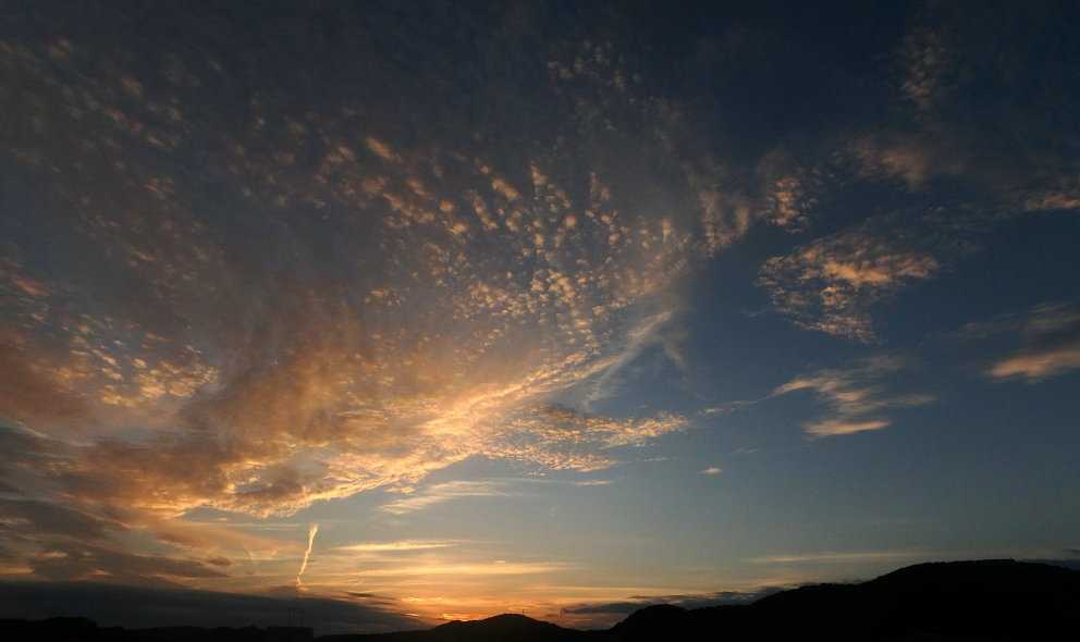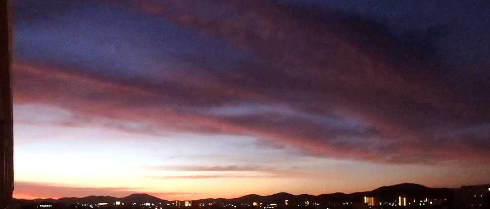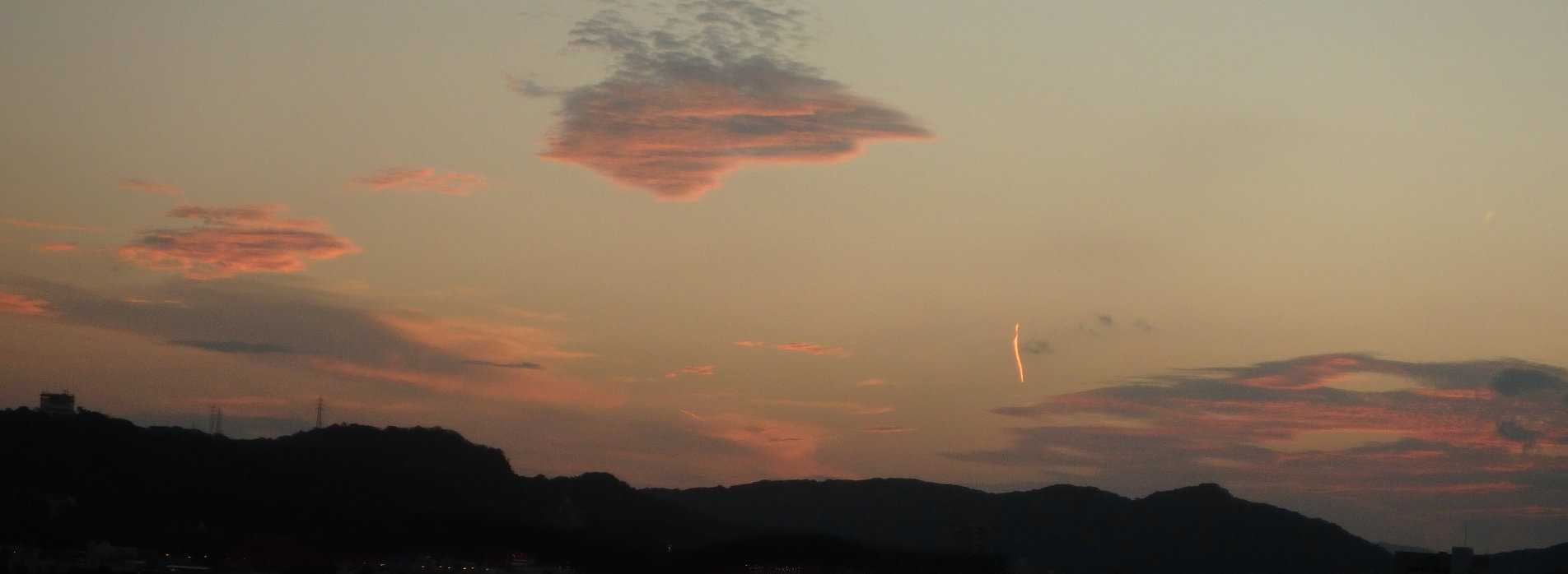 【9月29日17時58分の西の空。飛行機雲の一部と思われる細い雲が異様に明るい】