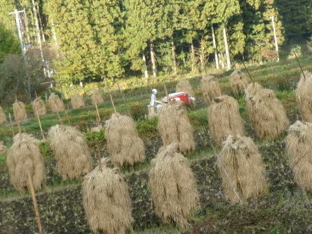 ゴ~ゴ~!山に響く脱穀機の音!今年も稲作作業終盤戦!連日の脱穀!有難い事にお陰様で雨は降りません 終わる迄どうか雨が降りません様にと祈る 今は何処の農家もコンバインなのでこの作業は無い ちなみに脱穀とは稲藁から籾の粒だけにする作業 農家30云年のうちですが代々の農家ではない この脱穀機も30云年前に中古で購入した物 何度も故障した 故障したら直すしか手はない 脱穀と言う過程を進めなければならない 何度も何度も修理を重ね何とか毎年脱穀が終わる 農業は本当に手動でやればお金はかからないが物凄く重労働!若い頃、本当にと~ちゃん人間ブルドーザー何て言われてた頃はいくらでも手動で出来た が、そんな事も有ったかと思うけど、もう無理… 米袋2袋3袋持てたあの頃が今は1袋だって結構重い 脱穀した籾は米袋に入ります それを全田んぼの全米袋を小屋に運ぶ訳ですがかなりしんどくなって来た様子 私は今年何度もギックリ腰を繰り返したのも有って重い物持つのが怖い パンの粉袋の出し入れもと~ちゃんを呼ぶ 「と~ちゃん~粉~!!」嗚呼、嫌になっちゃうなな… 秋の日は釣瓶落とし!あっという間に夕方!とっぷり日が暮れてしまう 目が見えるまでは電気は点けず米袋を軽トラに乗せる タイヤがパンクするのを恐れて一気には載せない つい3日程前私がパンクさせた… 「こんなに突然ペッちゃんこになる!?」と~ちゃんがポツリ… そんなこと言ったって突然ガタンガタン…って…  小時飯にはチーズケーキを焼いた!楽しみも無きゃね!柿を乗せればそれなりに高級ケーキに!秋空の下、脱穀続きます