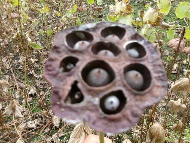 我が家に続く一本道のビオトープ 見事な白ピンク黄色の蓮の花を咲かせていた 花が終わると実をつける これが蜂巣と言われる花托(かたく)ができ緑色のどんぐりの様な種ができます これが蓮の実 栄養豊富パワーフード!漢方食材!蓮の実の食べ方は未熟で柔らかい実は皮を剥いて生で食べたり茹でるか炒るとまるで落花生!実を採った蜂巣は乾燥させドライフラワーに添える お花屋さんのドライフラワーを見るとこの蜂巣が入るといきなり値段が上がる 貴重で縁起があるらしい 我が家も実を食べ終えた後は蜂巣を乾燥!芸術の秋、何を作ろう何に飾ろう…色々頭に浮かぶ芸術の秋だ…