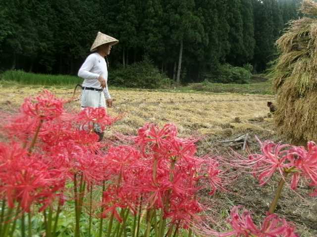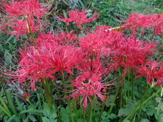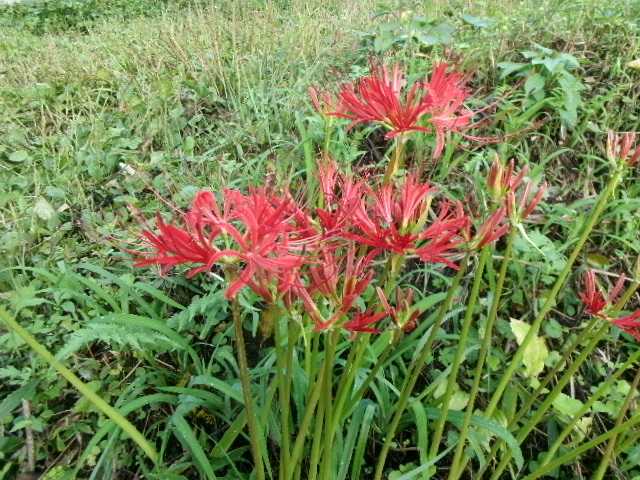 「彼岸だよ!」と一気に咲き出した彼岸花 ラジオから「曼殊沙華」が流れる季節 マンジュシャカと歌う百恵さん引退間近の頃だった様な… マンジュシャゲ本当らしい別名彼岸花が有名だが「幽霊花」とか「地獄花」とも呼ぶらしい ここに来た当初は火事になるからとか墓に生えてる花だから植えるな!と言われた 縁起が悪いとか?迷信とも思える言い伝えもかなり多い様な気も…? 「天界の花」というのも間違いない 人それぞれ 我が家は秋の花として田んぼを囲む 白色もあるとか?しかし、この花はやっぱり赤が良い 赤い彼岸花が「お墓参りに行こうよ」と促しています 又と~ちゃんの「千の風」が聞こえそうです笑