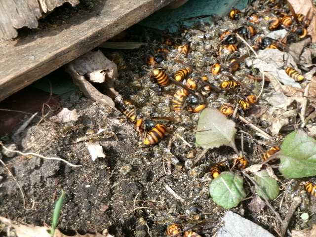 今年又復活したミツバチの箱!以前は山だからと勧められたがハチミツの匂いで熊が来るという事で子供達に危険が及ぶことを恐れて頂いたミツバチの箱は閉まったままだった子供達も巣立った今、密かに温存していたミツバチの夢を実現させた!熊ニュースが飛び交う昨今少し躊躇もしたが3か所に設置した 昔養蜂家の方が「無知蜂が居なく成っちまった」と嘆いていた事もあって直ぐには来ない物と思っていた が、春先に箱に先発隊が視察に来ているのを目撃! 気持ちが膨らむ… 何日か後、ミツバチの群れが3か所の箱に群れていた そのまま居住を決断するかどうか日々の観察 どうも気に入ったらしくそのまま暑い夏を過ごし秋になった そろそろ箱の中を覗いてみたい気持ちが逸る その矢先の出来事だった…ん?ミツバチ?イヤ、スズメバチが…?箱の前で外で沢山寝てる?いや、死んでいる… や、やられた~!?スズメバチの襲撃だ!スズメバチはミツバチを襲います 幼虫の餌の為でキイロスズメバチはミツバチを肉団子にして幼虫のエサにしオオスズメバチは成虫だけでなく幼虫や蛹も襲って全滅させますしかし、ニホンミツバチだけは熱殺蜂球攻撃という攻撃手段を持っているはず! 全員で羽音で威嚇をし群でスズメバチを囲んで熱を発し巣の中のスズメバチを焼き殺す攻撃法!があるはず!なのに!?ええ~なんで~?!?よくミツバチ先発隊は殺されてしまと言うが・・・中は…?絶望的・・・