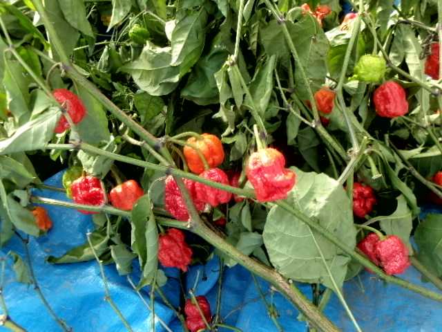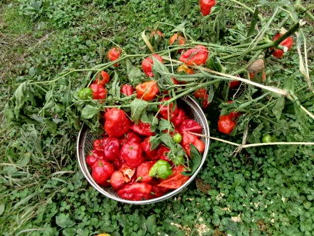 嗚呼、ピーマン採って置いてって言うの忘れてた!配達に出てから気が付いた 家に帰ってから自分で採ろう 家に帰ると玄関の前にピーマンが置いてあった オオ?以心伝心だわ…と ボールに個程入れ料理に取り掛かる トマト料理だから赤いピーマンよりやっぱり緑の通常のピーマンが良い 洗って半分に切り種を取り…玄関にはもう一つ大きな笊にキュウリ!最後のキュウリを収穫したらしい これも一緒に洗ってパンパンパンと大雑把に切って行く ポンと切れ端を口に投げ込む 何かいつもと違うな… と思いつつもパッパと料理を続ける キュウリの後は洗ったピーマンをザクザク切り… 横に作業を終えてを洗う家族「ん?ん?ん?それもしかして外に置いといた奴?」「そうだよ!」「ええええ~~!?」「何?」「大丈夫?」「何が?」「それブートジョロキア!」「何それ?」「ハバネロの10倍の辛さの唐辛子!死ぬよ!」「エエエエ~~!?」そう言えばさっき口に入れたキュウリがやけに辛かった様な!手が急にヒリヒリし始めた!さっき口に入れた時に多分触れた唇がヒリヒリし始めた!エエエエ~~!まさかのジョロキア!?でも、今、知ったから良かった!食べてからじゃ遅かった!と~ちゃんと2人ニュースになる所だった…それにしても触ったんだろうな…鼻もホッペも顔中ヒリヒリ…!目擦らなかったから良かった… それにしてもピーマンそっくりじゃない?絶対そばに置いておかないでね 死なずに済んだ キノコも沢山出ていますが食べません 生きている事に感謝してこれからも生きていきましょう 変な蝶!まるで悪魔!ハロウィン間近