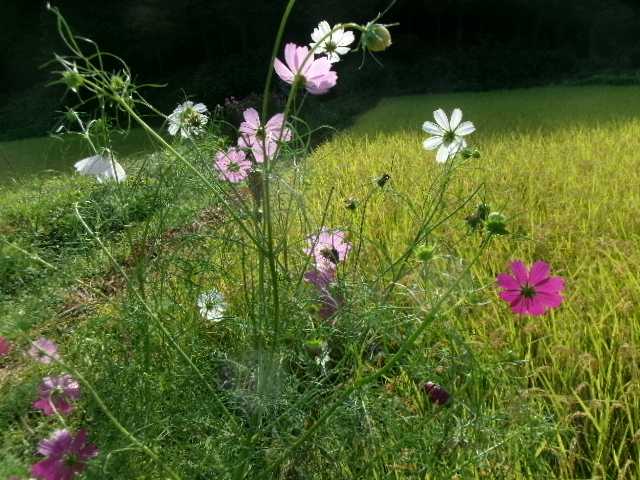 10月と言うのに未だ暑い 何時に無く青より蒼い空にギラギラの太陽の下稲刈り続行中!こんなに暑い稲刈りも経験上初めてかも?人生何があるか分からない 汗ビッショリの稲刈り この先もこんな事を体験するのだろうか… 等と考えながら稲を掛ける 3時も過ぎると西の山に太陽がお隠れ そうなると急激に冷え込んでくる!さっきの汗が一気に冷え寒気さえも… と~ちゃんが稲を刈っている時は黙々と稲を運び稲を掛ける 足元にはモグ しきりにイナゴを食べる たまにカエルを追いかける姿が目に映る モグに話しかけても返事はない ちらりとこちらを見る「何か言った?」モグしかもういない我が家 何処かの山で鹿が鳴く「ピーーーー」オス鹿か… そんな季節か… 嗚呼、昨年はララが鹿の声に吠えていた そして、ミ~ちゃんがいた 黙々と稲かけする中で様々な思い出が蘇る時間 これも良いかも… 普段過去を忍ぶ何て事はしない秋の夜長は疲れ切った体で一気に熟睡だしね(笑)家の前のコルチカムが一気に開花!稲刈り後半戦、老体にムチ売って?イヤ体を労わりながら残りガンバだね