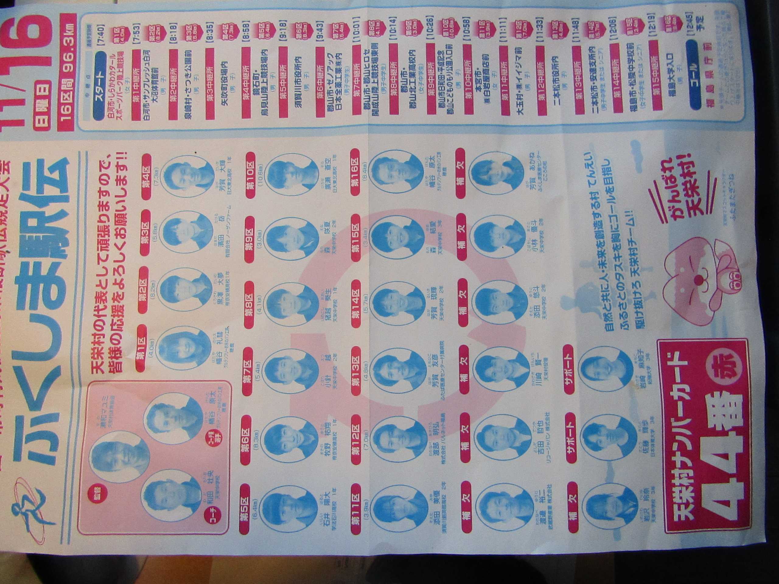今年もそんな時期?月日の流れが早過ぎる… 冬支度真っ只中ですが今度の日曜日は福島駅伝!いつの頃からか我が家の一大イベントになった!長男を初め長女次女次男三女と子供達全員が襷を繫いだ福島駅伝!元々はと~ちゃんはスポーツ万能タイプではあったが母の私自身運動音痴だし第一高校時代秋の長距離走と言うのが一番嫌いな行事だった だから興味等全く無かった「へ~こんなのやってるんだ~!こんなに走るの~!?大変だね~…」と他人事だった たまたま出かけた時に応援してと旗渡され頼まれた事もあった 「がんばれ~!」と言いながらも何て大変な競技なんだろう 選ばれる選手ってどんな人なんだろう…永遠にうちには多分無関係… 等と思っていた昔 まさかの我が子供達が全員次々に駅伝部に入るとは思わなかった 選手何てもまさか!の天然母でした 中学に入ったばかりの長男が朝早くから起きて来た「こんなに早くにどうしたの?」「今日から朝練!」『何部に入ったの?」「駅伝部!」「え!?え!?え~!?ほんと~!?」「全員なの?」「違う!友達に誘われた!」「え~!?そうなんだ~!」等と驚いた事も覚えている あれから3年後長男が選手に選ばれた時はビックリでもあったが息子よよく頑張ったな!と親乍ら感動もした その時かな?長女も選手に選ばれたっけ そう、長男の影響で次々と兄弟姉妹が駅伝部に!そうなるともう親も疑う事も無く協力体制になった 高校卒業と共に兄弟が駅伝から離れたが長男だけは続けていた 遠く離れた町に就職した時も故郷選手で天栄選手として走った まさかの母の私が長距離走に励むようになり、いつの間にか家族でマラソン大会に出る様になった その長男が結婚し天栄に戻って来た 走るのが大好きなお嫁さんを連れて!そしてその年から嫁さんも選手に! ここ3年は幡谷家では長男夫婦だけが大会で頑張ってくれていた しかし今年遂に恐れていたことが起こった「チームが組めない!?」女子が足りない!というのだ!天栄駅伝チームのコーチ兼選手の長男、悲痛な叫びで「今年、駅伝ダメかも!天栄選手が足りない!複合チームになるかも!」と…その叫びが兄弟姉妹にリレーされた!早速我が家のインフルエンサー長女が発揮する!全国に呼び掛けてくれた 「我が天栄村の駅伝チーム存続危機!」一気に拡散された!(らしい)そんな家族リレーもあり危機を脱した(らしい)良かった!今年も何とか全選手が揃った 天栄チーム赤ゼッケン44です!来週に迫りました!1区我が嫁さんアンカー16区長男が走ります!沿道からの応援、どうか宜しくお願いします!