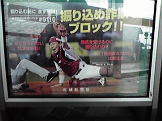 郵便局に振り込みに行ったら,振込機の横に掲示板・・・。 視線を落とすと・・・そこには嶋選手のポスターが!! 『振り込め詐欺』防止のため県警が作ったものです。 一番下(膝より下)の位置に貼ってあったのでしゃがんで写メ撮る私は,とても怪しかったと思います