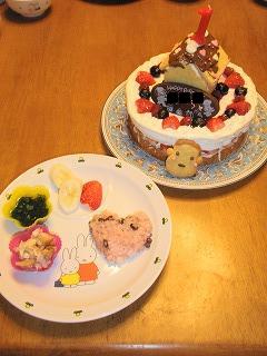 3号の 3号の誕生日♪(父)が単身赴任先から帰ってくるというので,ちょっと早いですがお祝いしました。 ケーキは2号によるデコレーションスポンジの上に,クッキーで作ったお家が建っています。(ばあ)が赤飯を炊いてくれましたので,ハート型に盛ってみました。カレイの煮付けとほうれん草も花形のしきりに入れて飾りました。 ケーキに興味津々。右手に注目!クリームがついちゃいました。この後,ぺろりと口に運びました。3号のお顔クッキーは,今回も「共食い」しました。 あっという間の1年。ここまで,すくすくと成長してくれました。突発性発疹の発疹が残っているけれど,熱が下がってご機嫌でした。
