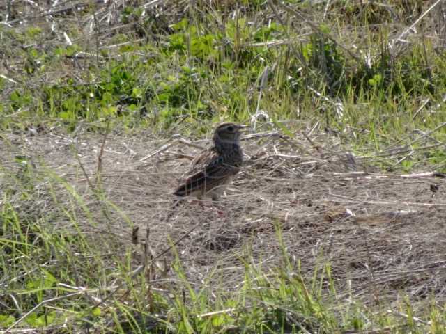ヒバリを見かけました。こちらを向きました。反対側を見ました。畑の中にいました。いい天気の日でした。
