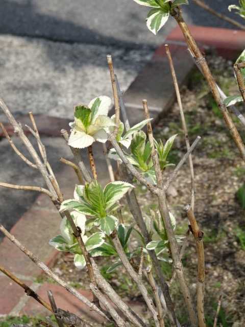 アジサイが芽吹いていました。斑入りの葉でした。横には 大きな木が立っていました。やわらかい陽射しでした。