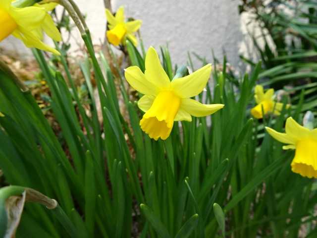 スイセンが咲いていました。黄色い花でした。花壇で咲いていました。鮮やかな色でした。