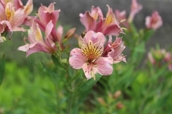 道端で花が咲いていました。アルストロメリアのようです。つぼみもありました。たくさん咲いていました。花びらの模様が華やかでした。