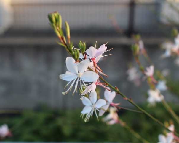 道端の花壇で咲いていた花です。ガウラ、別名はハクチョウソウです。白くて小さな花でした。ふわりと浮かんでいるようでした。よく晴れた朝でした。