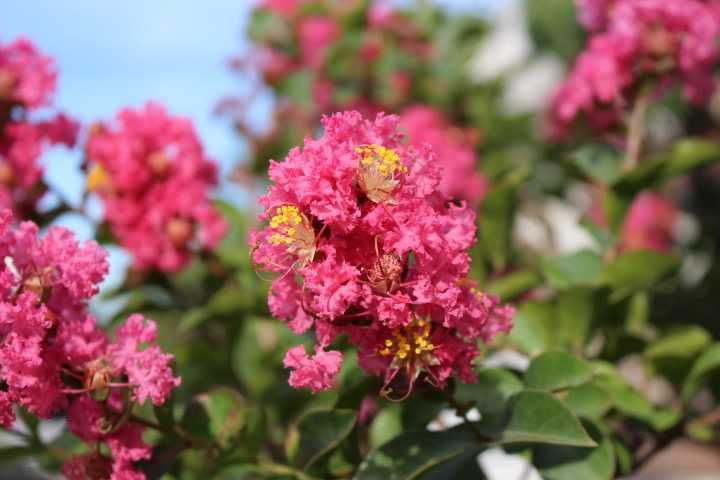 サルスベリが咲きました。花の向こうは青空でした。下の方の房は 小ぶりでした。朝日が やわらかく照らしていました。