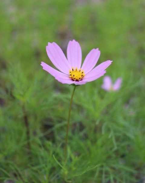 コスモスが咲いていました。小さな虫がとまっていました。地面に近いところで咲いていました。夏にコスモスが咲くのだなと、しばらく眺めました。