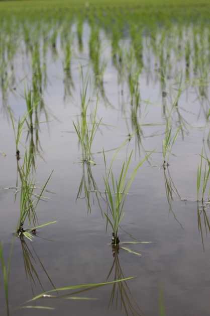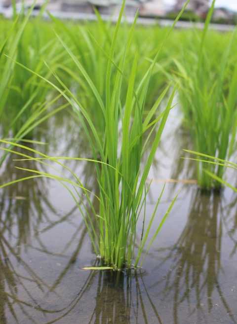 イネが大きくなっていました。弱い風が吹いていました。緑の列になっていました。陽射しの強い日でした。