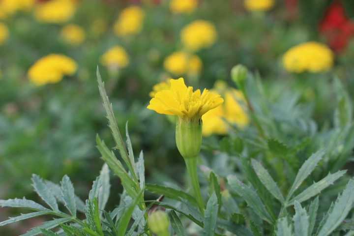 マリーゴールドが咲いていました。オレンジ色の花も咲いていました。道端の花壇で咲いていました。よく晴れた日の夕方でした。