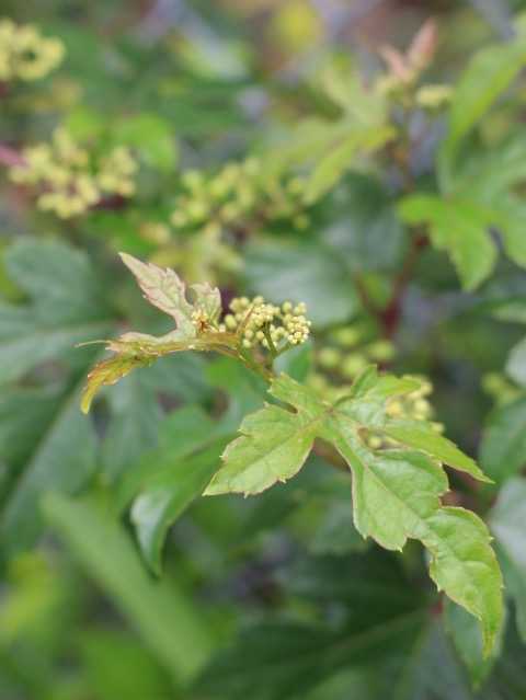 公園のフェンスから伸びていた葉です。ノブドウの1種で、キレハノブドウのようです。実がついていました。フェンスの上にも葉が伸びていました。面白い形の葉でした。
