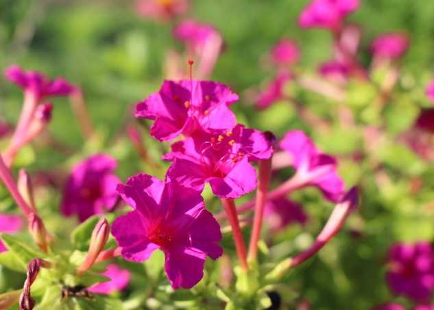 オシロイバナが 咲いていました。道端の花壇で 咲いていました。いい天気の日でした。花の色が 鮮やかでした。