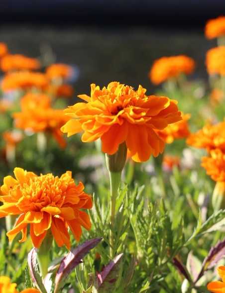 マリーゴールドが咲いていました。鮮やかな オレンジ色でした。道端の花壇で 咲いていました。よく晴れた日でした。