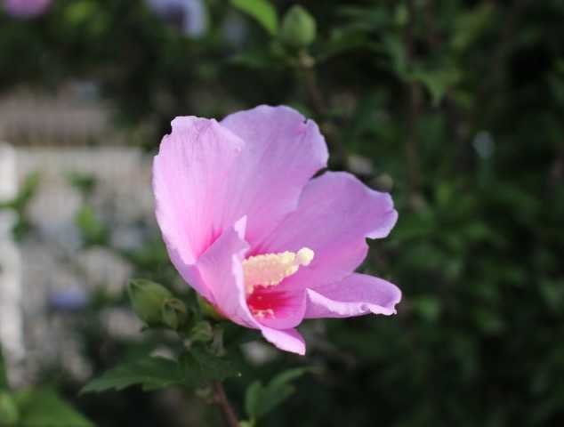 ムクゲの花が 咲いていました。朝の光の中で 咲いていました。木の中ほどでも 咲いていました。淡いピンク色でした。