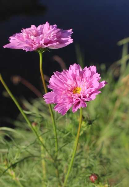 コスモスが 咲いていました。八重咲きの ダブルクリックという 品種のようです。つぼみも ついていました。いい天気の日でした。花に陽射しが 降りそそいでいました。