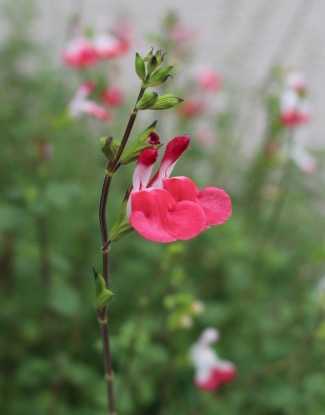 道端の花壇で、咲いていた花です。チェリーセージの ようです。サルビアの仲間で、サルビア・ミクロフィラとも 呼ばれます。観賞用の ハーブだそうです。たくさんの花が、咲いていました。印象的な 形でした。