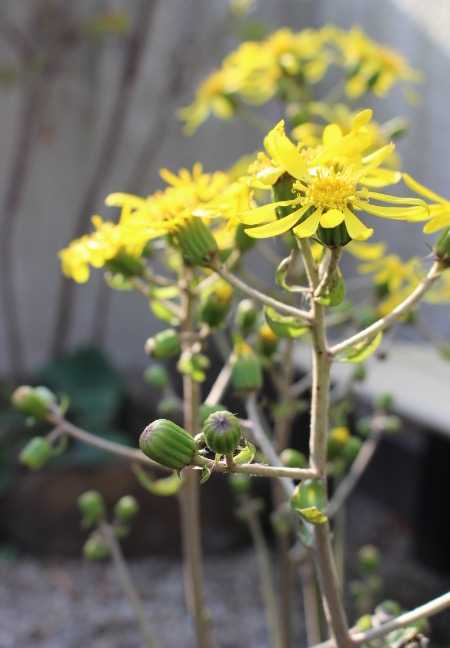 ツワブキが 咲きました。よく晴れた 朝でした。花をしばらく 眺めました。かすかに甘く 爽やかな香りが、鼻をくすぐりました。