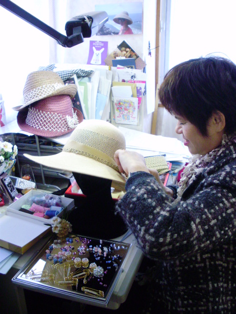 Staffのイワサキです店長がデザイナーらしい作業をしていたのでパチリ 近頃はこういう作業よりもあちこち動き回ったり、書類とにらめっこしたりする時間が多い店長。「いや~こんなトコ撮るの」と言いつつ撮らせてくれましたなんでもない帽子がちょっとコサージュやリボンをあしらうだけで、なんとカワイクなることか尊敬します・・・。