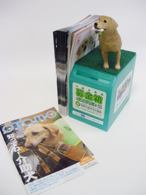 店長の松井ですご縁あって、日本介助犬福祉協会の理事長の川崎さんにお会いしました。そこで、介助犬育成事業の現状など貴重なお話をお伺いしました。 そこで、弊社も少しでもお力添えができればとかわいい募金箱を設置することにしました。よく見ると、携帯を持ってるんですこの募金箱は化粧品や健康食品メーカー大手のDHCさんのご支援で完成したモノだそうです。このブログを読んでいただいて、ご興味を持たれた方はぜひ、日本介助犬福祉協会のHPをご覧ください