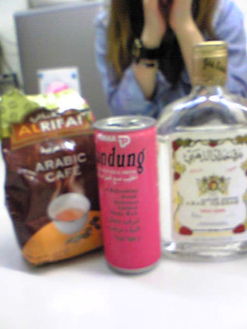 今日、うちの会社の上司がおもしろいお土産を持ってきてくれました。なんでも、ドバイからのお土産らしい。左から、ドバイのコーヒー・バラのジュース、ドバイのお酒。 まずは、左のコーヒー。袋を開けた途端、プ~ン強烈な青いニオイが・・・??「うっ・・・」もう一度ニオイを嗅いでみる みんな口々に「くさッ」 でも、一応おみやげやし、飲んでみるか・・・。コップにすこーしだけ入れて、お湯をそそぐとまたプ~ンとハーブやら香辛料やらなんやわからんけど、ものすごい・・・・ 思い切って一口飲んでみる。「んん???」意外と味は・・・普通のハーブティーまぁ、でももういらん・・・。 次に真ん中のローズジュース。これに期待イメージは透き通ったピンクのさわやかジュース。缶を開けて、コップに注いでみました。「????色が・・・」「あっ!?クサっ!!!」こいつも強烈なバラの芳香剤のニオイが・・・しかも、色がイチゴ・オレみたいやし・・・。 よし、飲んでみるか。「ゴクッ・・んーーーーー・・・」「なんか、バラの入浴剤飲んでるみたい・・・。」「色はかわいいし、コップに入れてトイレに置いといたら、 芳香剤代わりになりそうやね。」 最後にお酒はニオイだけ嗅いでみることに。「うぅ・・・・・・」期待を裏切らないニオイでした。。。。 ドバイのお土産なんかめったにお目にかかれないし、貴重な体験でした。どれもドバイではスタンダードな飲み物だそうです。 試飲会のあと、緑茶をすすり、「やっぱり日本人でよかったな」とつぶやいておりました。