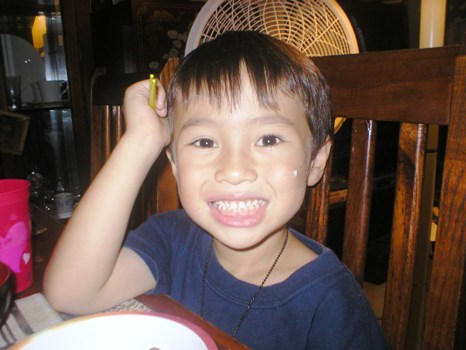 食事中にごはん粒がほっぺたについたので、その写真を何気に撮ろうとしたら、カメラに気づいて思い切りの笑顔・・・。 (*^^*)